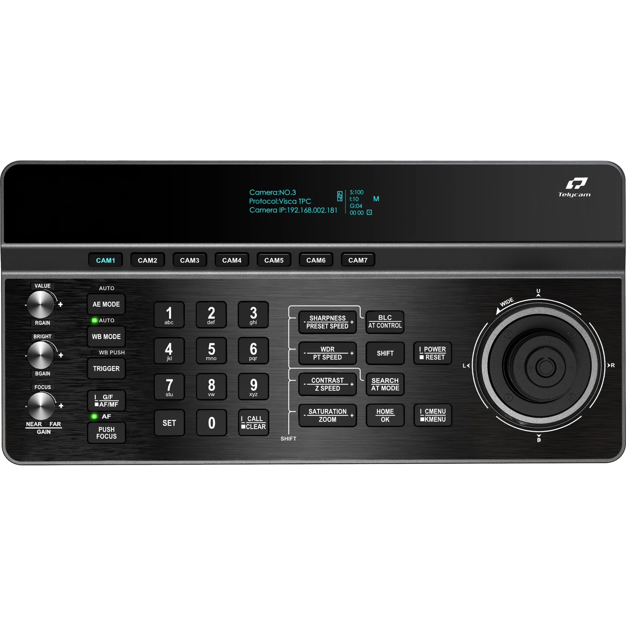 Telycam V-Joy+ AT BK is a professional PTZ camera controller built for control rooms, OB trucks and live streaming rigs. A bright 3.12-inch (79.2 mm) OLED presents camera, network and preset feedback clearly, while a 4D joystick delivers proportional pan/tilt/zoom and one-push auto focus. The interface groups AE/AF/AWB, presets and multi-function keys logically so operators can execute framing, focus and exposure changes without leaving program. The auto-tracking section goes further: toggle Tracking Switch, set Target Position, PT Limitation, Initial Position and Blackboard Area directly from the panel to govern subject capture during live moves.