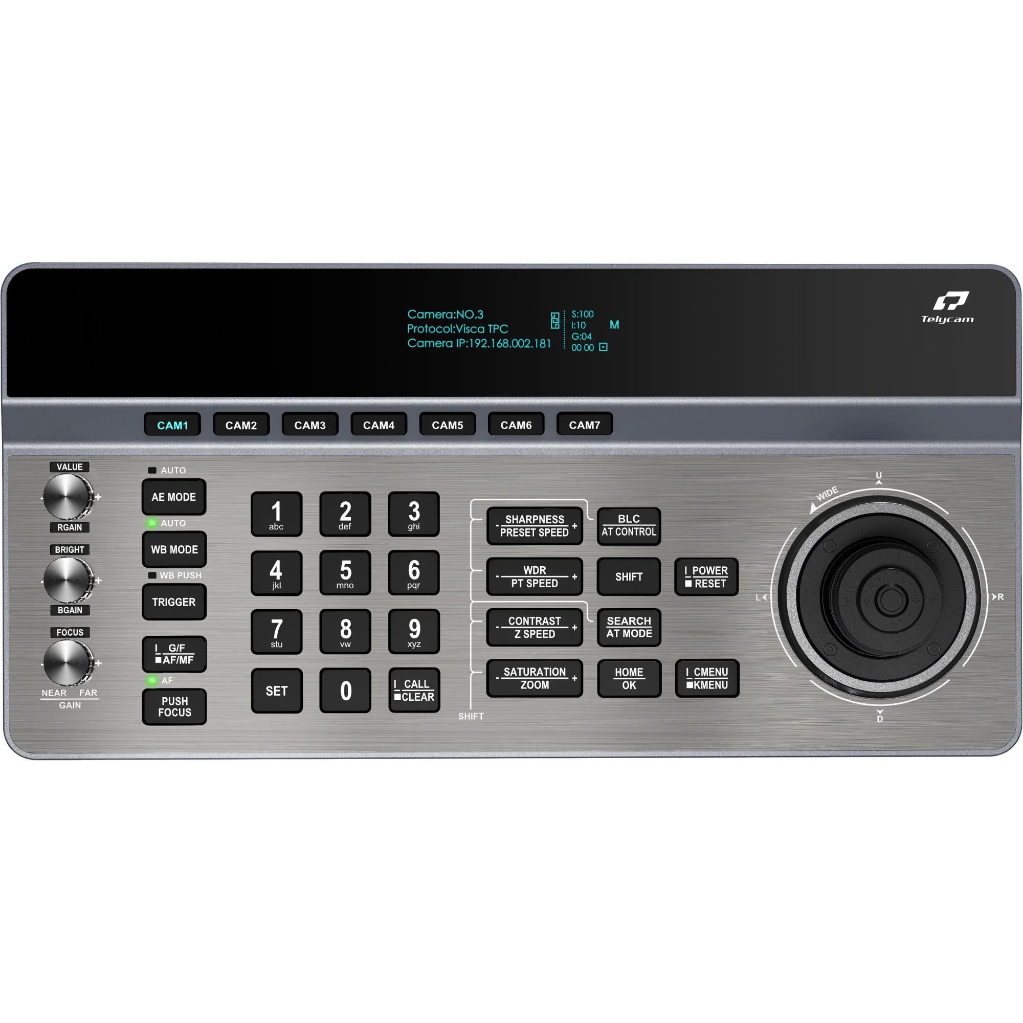 Telycam V-Joy+ AT SI is a professional PTZ keyboard for fast multi-camera operations. It merges IP and serial control in one surface: NDI|HX, VISCA over IP (TCP/UDP), ONVIF, and Pelco P/D across RJ45 with IEEE 802.3af PoE, plus RS-232, RS-422 and RS-485 on board. A responsive 4-axis joystick governs pan, tilt and zoom, while a press triggers instant auto-focus. A 3.12-inch OLED status display (256×64) shows protocol, IP, baud rate and camera state at a glance, so operators keep attention on the program feed, not the menu.