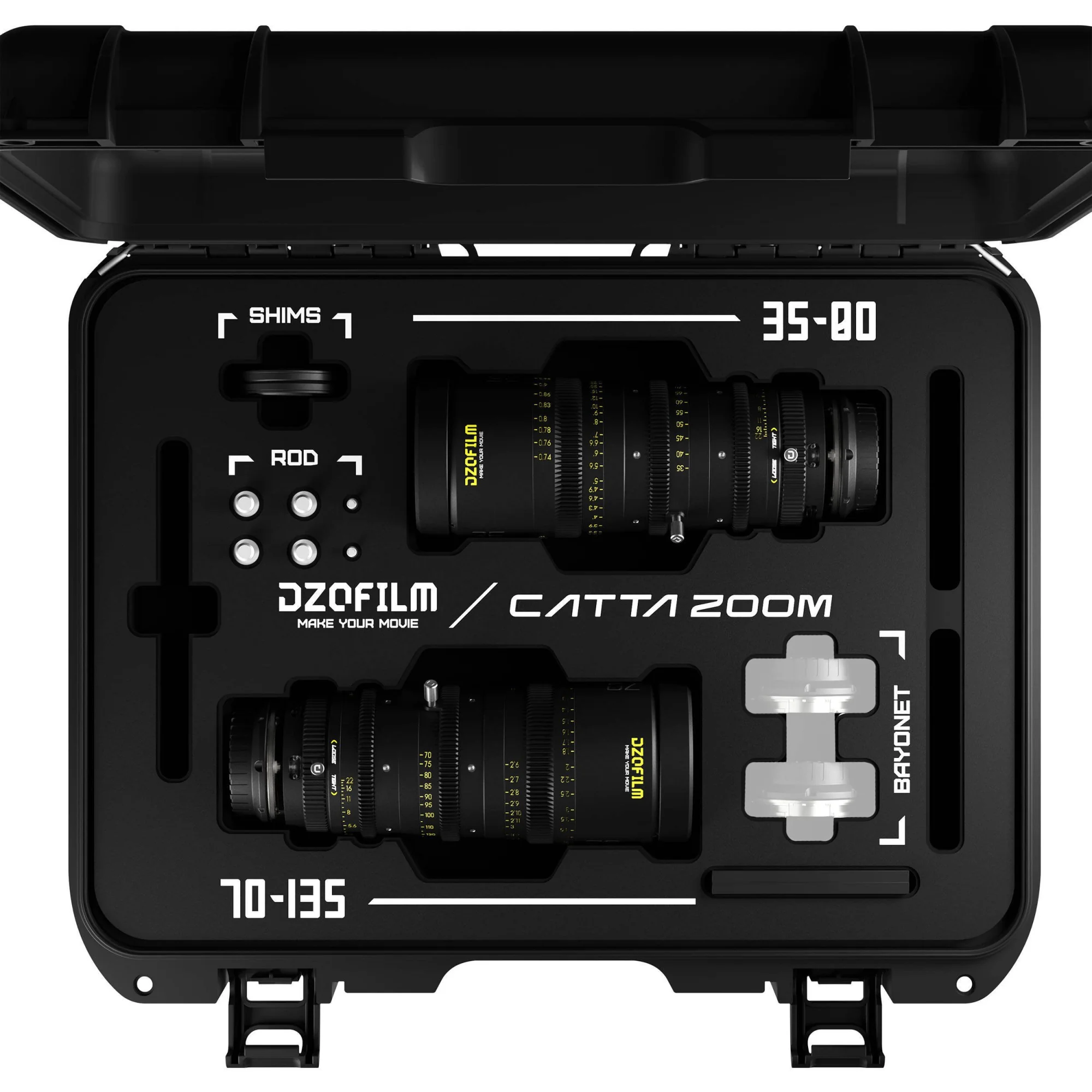 Add two full-frame zoom lenses to your production kit to cover multiple focal lengths and cameras with this Catta 35-80mm & 70-135mm T2.9 E-Mount Cine Zoom 2-Lens Bundle from DZOFilm. The kit includes a black Catta E-mount 35-80mm T2.9 zoom lens, a black Catta E-mount 70-135mm T2.9 zoom lens, two front lens caps, two rear caps, two shim sets, two support bases, and two support rods.