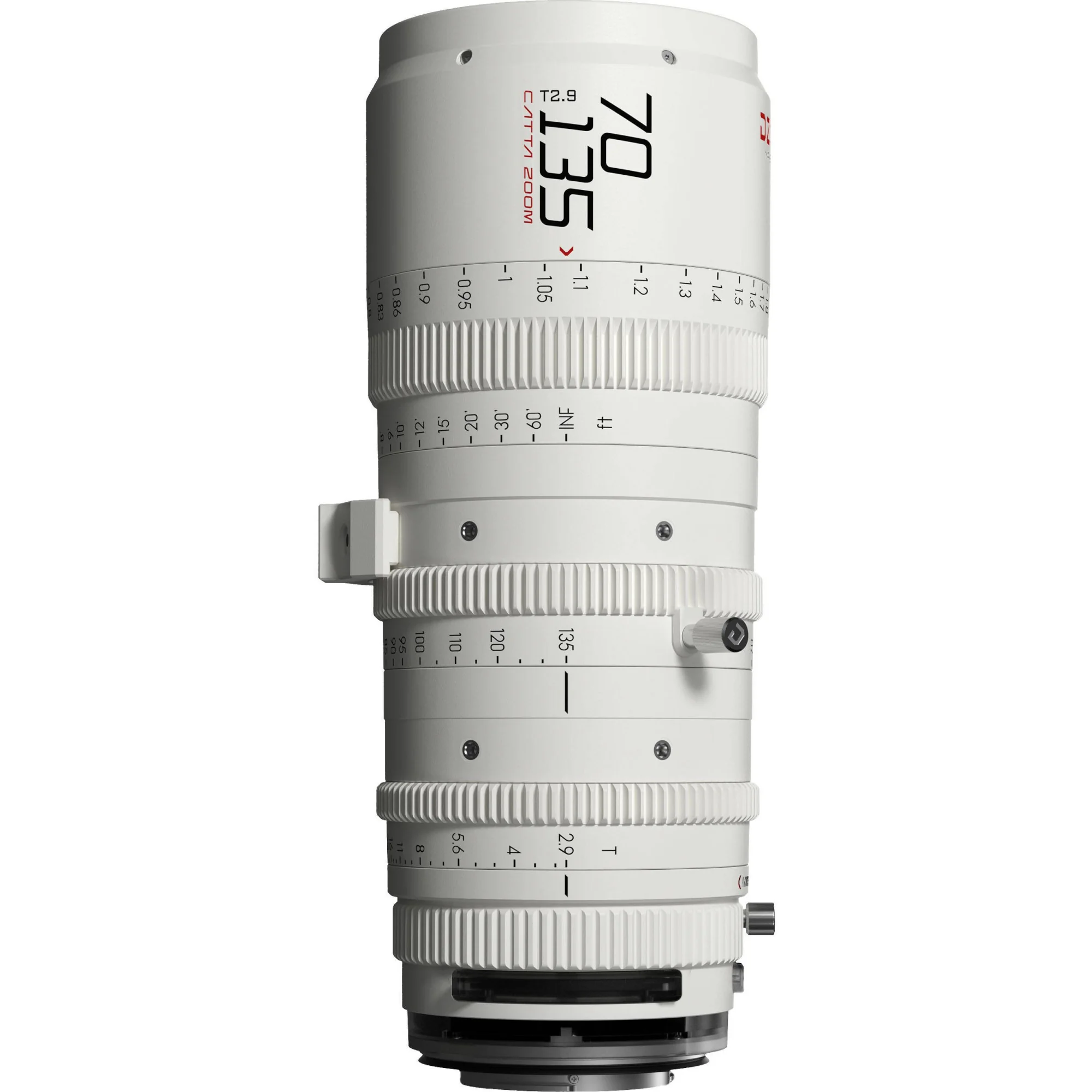DZOFilm Catta Zoom 70-135mm T2.9 White Sony E Mount (FF) est un zoom cinéma parfocal pour capteurs plein format, couvrant un cercle d’image de 43,5 mm. L’ouverture constante T2.9 et le diaphragme à 16 lamelles assurent une transition douce des hautes lumières, une exposition stable et un bokeh régulier. La formule optique limite la respiration de mise au point, conservant le cadrage lors des tirages. La mise au point minimale de 0,76 m (2 ft 6 in) permet de cadrer des détails serrés sans déplacer la caméra.
