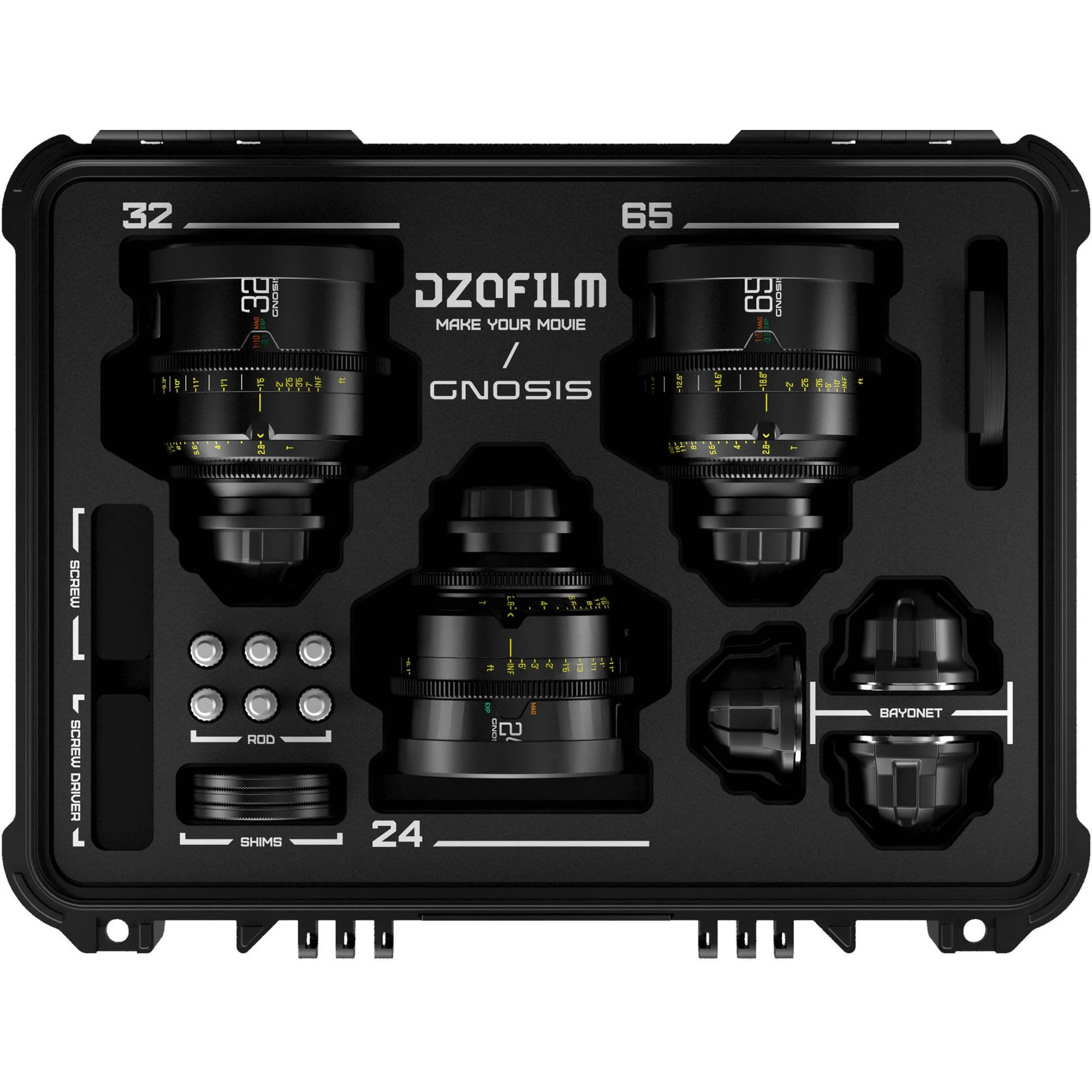 DZOFilm Gnosis Macro 3-Lens Kit (24/32/65 T2.8) réunit des optiques macro VV/FF rigoureusement appairées. Le cercle d’image de 46,5 mm couvre les capteurs full-frame et VistaVision tout en conservant une colorimétrie et une transmission homogènes d’une focale à l’autre.