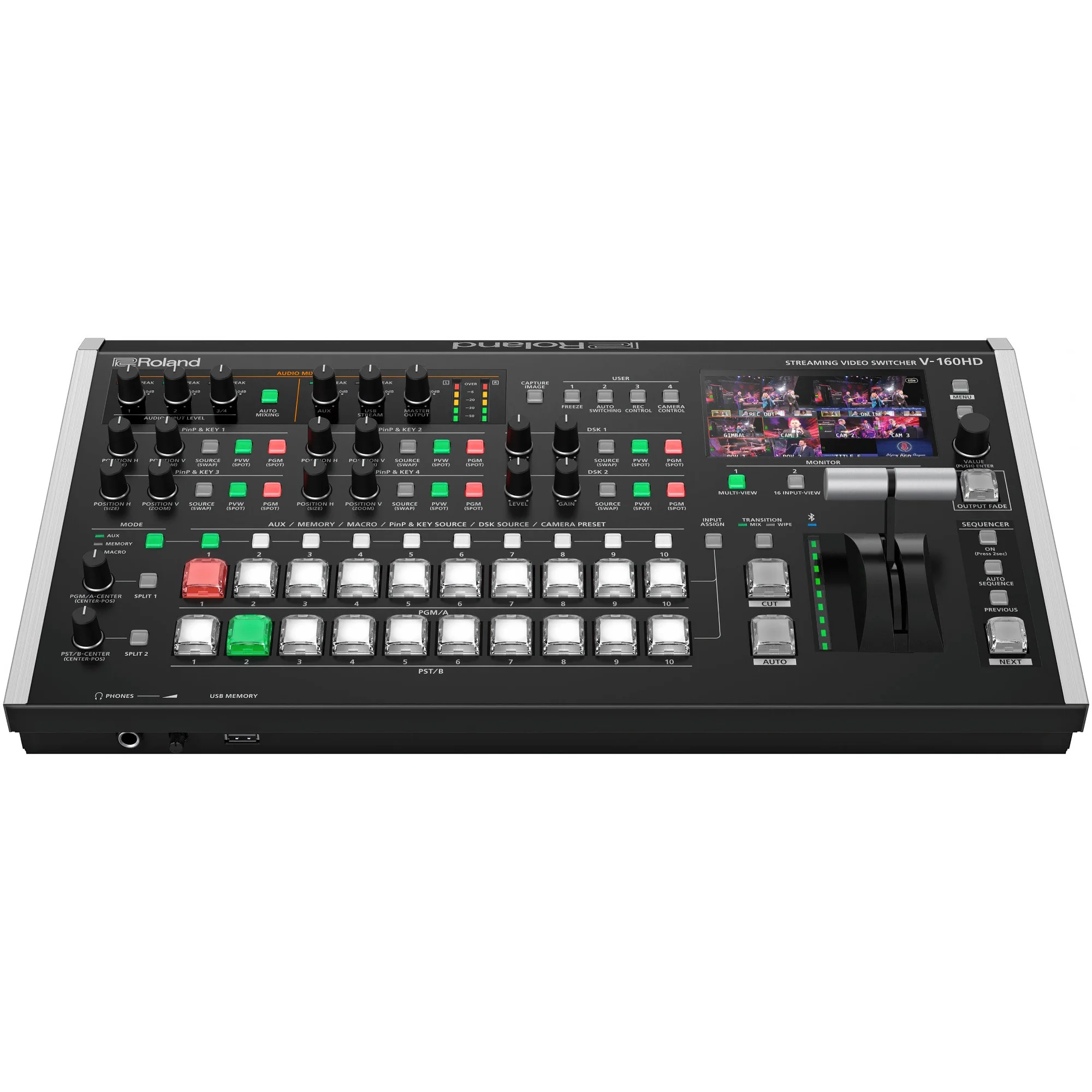 Roland V-160HD est un switcher Full HD hybride avec 8 entrées HDMI + 8 entrées 3G-SDI (convertisseurs de cadence sur toutes; scalers sur HDMI 1–4). Sept sorties assignables—3 SDI, 3 HDMI, 1 USB-C—couvrent Program, Sub-Program, Preview, trois Multi-Views et AUX. L’USB-C opère en webcam UVC/UAC pour du 1080p à 23,98–60 i/s (YUY2/MJPEG), diffusion directe vers les plateformes majeures sans pilote.