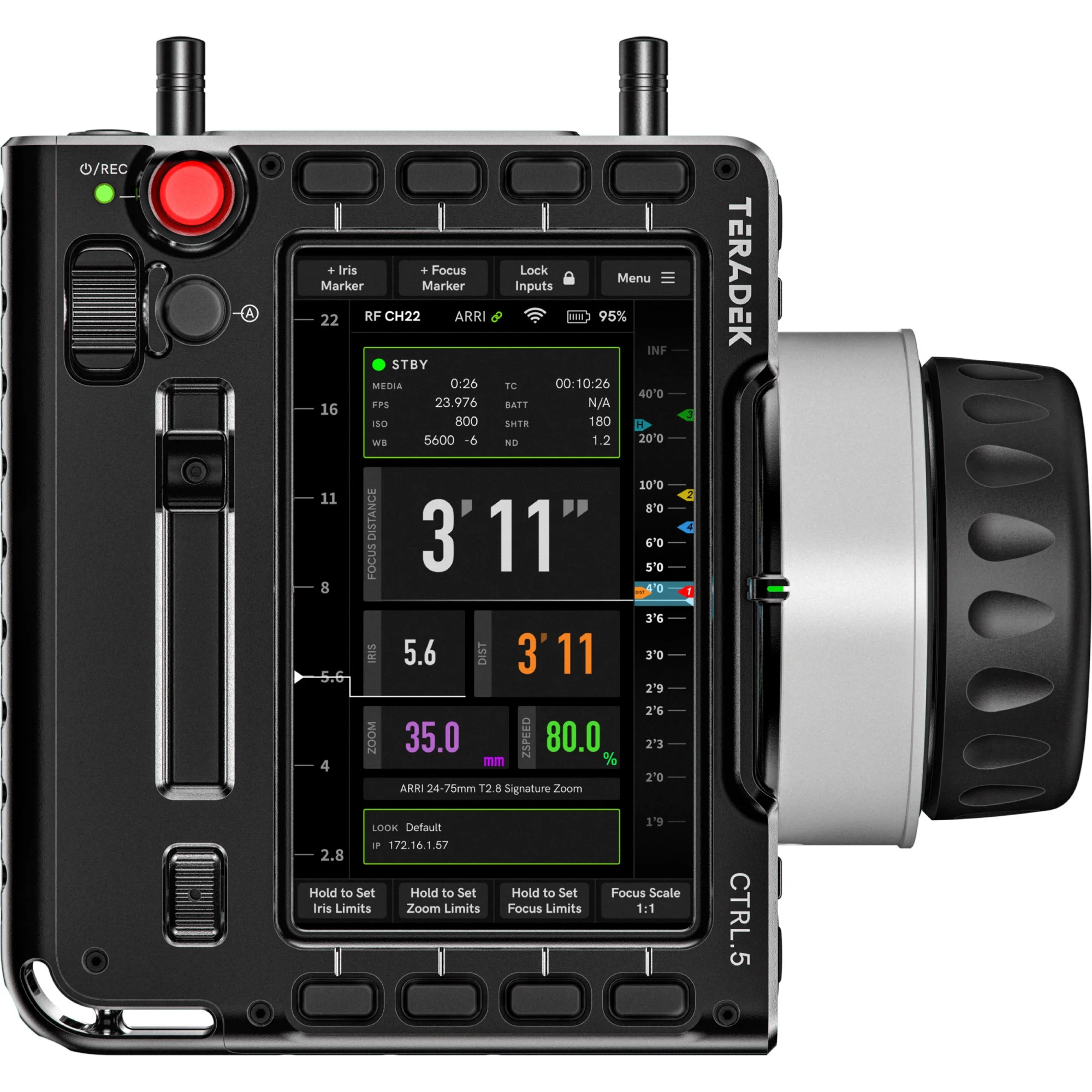 Pour les tournages intensifs, CTRL.5 communique avec récepteurs/moteurs Teradek RT pour un contrôle radio avec une portée de 5000 ft (1524 m). Une Bibliothèque d’objectifs et le mappage interne mémorisent repères de bagues et métadonnées pour des changements rapides. Repères numériques, calculs de profondeur de champ et d’hyperfocale s’affichent instantanément, accélérant les transitions et mouvements répétés. Des licences Camera Control Wi-Fi donnent accès aux paramètres clés des caméras RED et ARRI via IP, unifiant objectif et caméra.